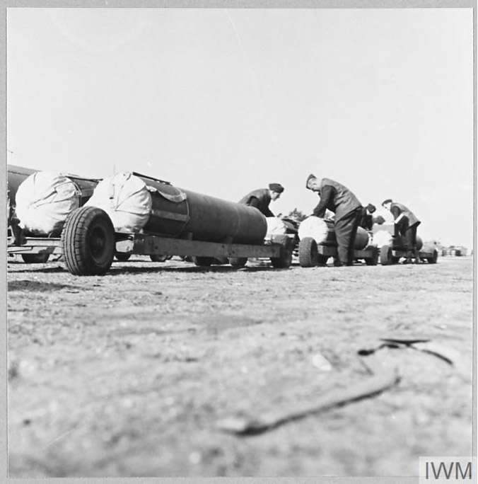 A 4,000lb Cookie is surrounded by Small Bomb Containers each holding up to 90 incendiaries.